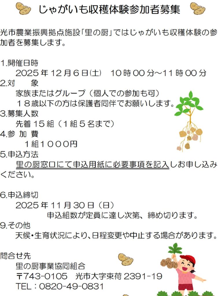 里の厨の体験事業として、12月6日(土)10時からじゃがいもの収穫体験を開催します! 土の中からごろごろ出てくるじゃがいもを掘り起こす🥔貴重な体験をぜひ楽しんでください😊 参加費:一組1,000円お申し込み:里の厨事務室 […]